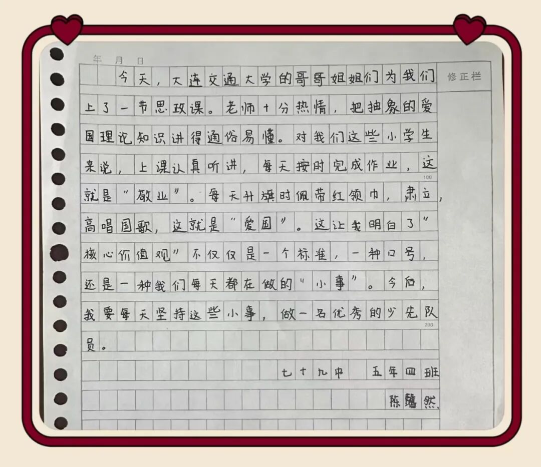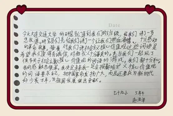 一堂浸润初心的宣讲,在同学们心中留下了深深的印记。课后,孩子们纷纷用稚嫩而真挚的语言,写下自己的所思所感————