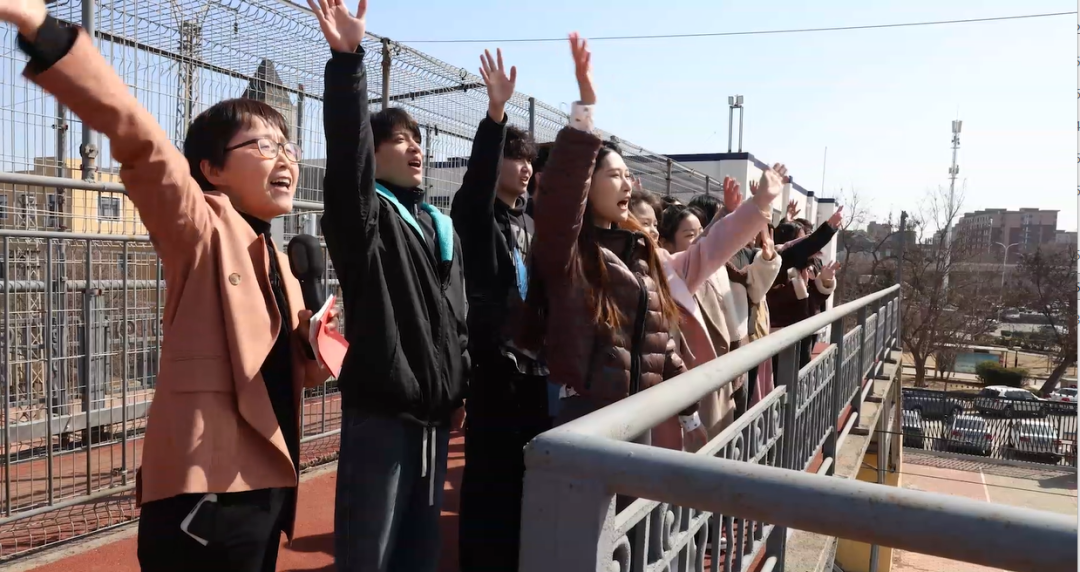 站在天桥上,上下行两趟高铁列车在站内会车的景象更是让同学们深切感受到当今中国科技的自立自强和祖国的繁荣强大。