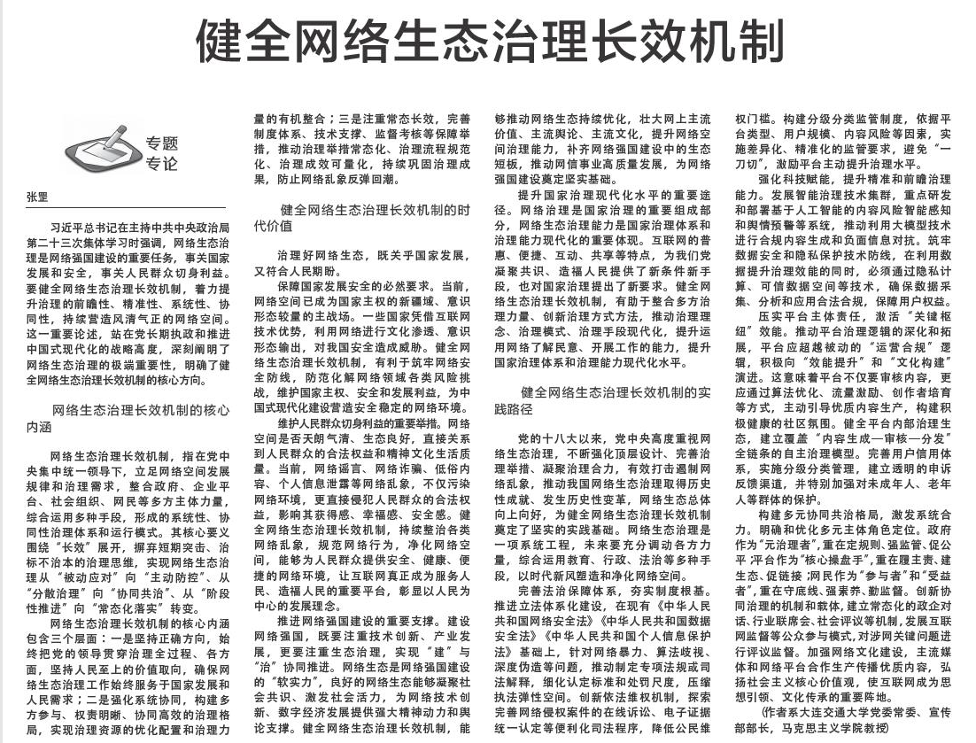 近日,我院教授张罡撰写的理论文章《健全网络生态治理长效机制》,刊发在2026年3月5日《中国教育报》“理论周刊”栏目。